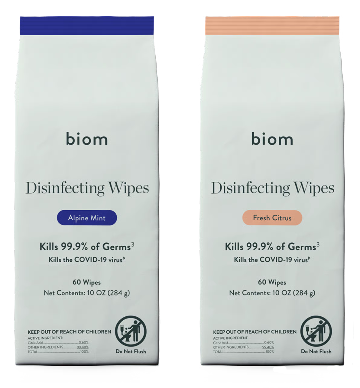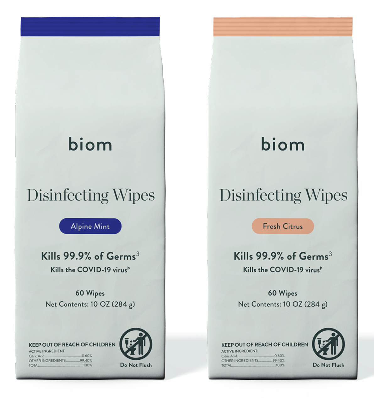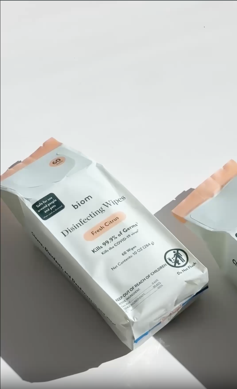 Biom Disinfecting Wipes kill 99.9% of bacteria and viruses*, including SARS-CoV-2, with an effective, botanical formula made with just water + 10 simple ingredients. Powered by plant-derived citric acid, this disinfectant is designed for everyday use without harsh fumes, quats or bleach.