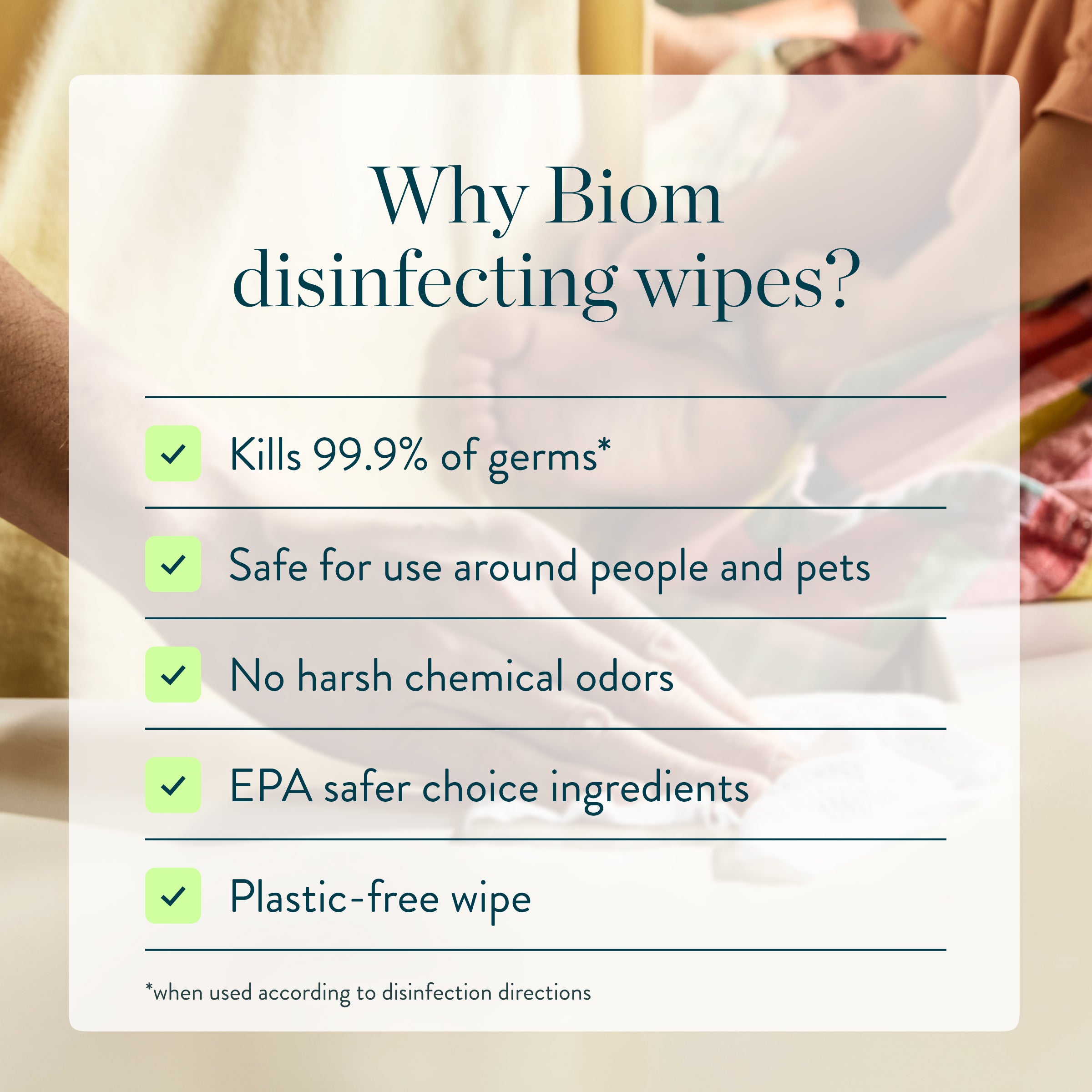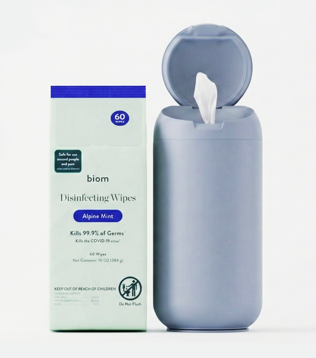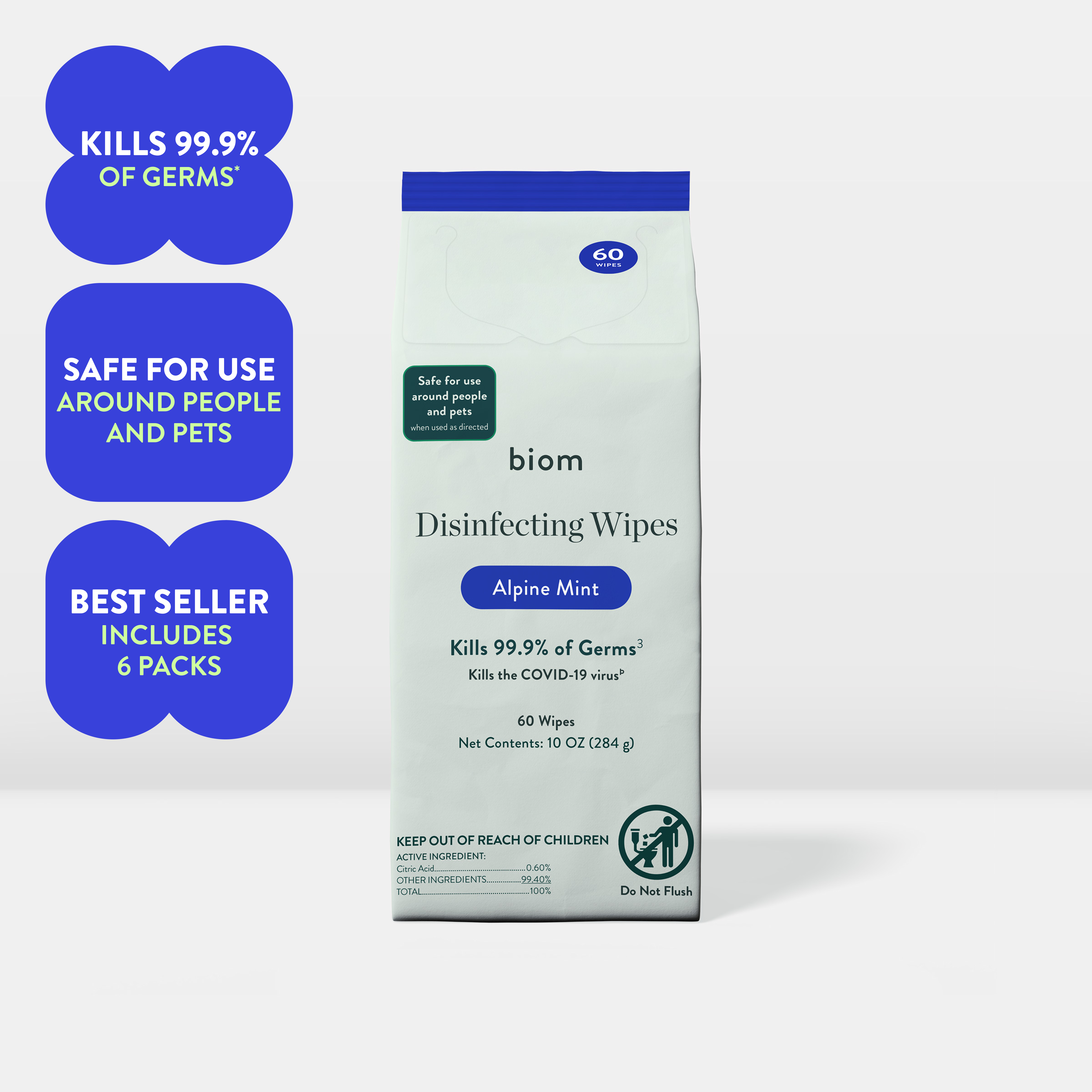 Biom Disinfecting Wipes kill 99.9% of bacteria and viruses*, including SARS-CoV-2, with an effective, botanical formula made with just water + 10 simple ingredients. Powered by plant-derived citric acid, this disinfectant is designed for everyday use without harsh fumes, quats or bleach.