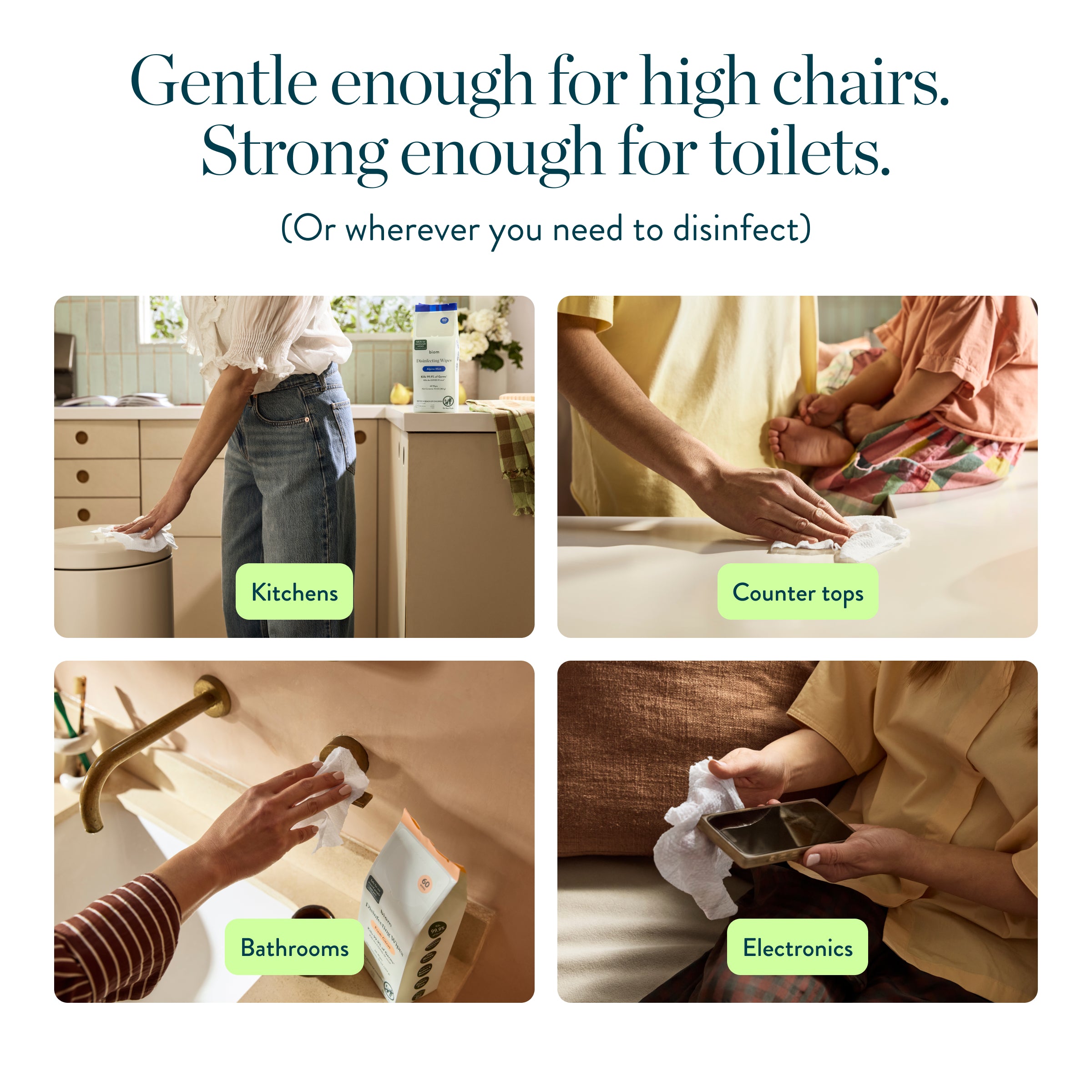 Plant-powered disinfecting wipes that kill 99.9% of germs* in 30 seconds without quats, plastic, or harsh chemical smells.
